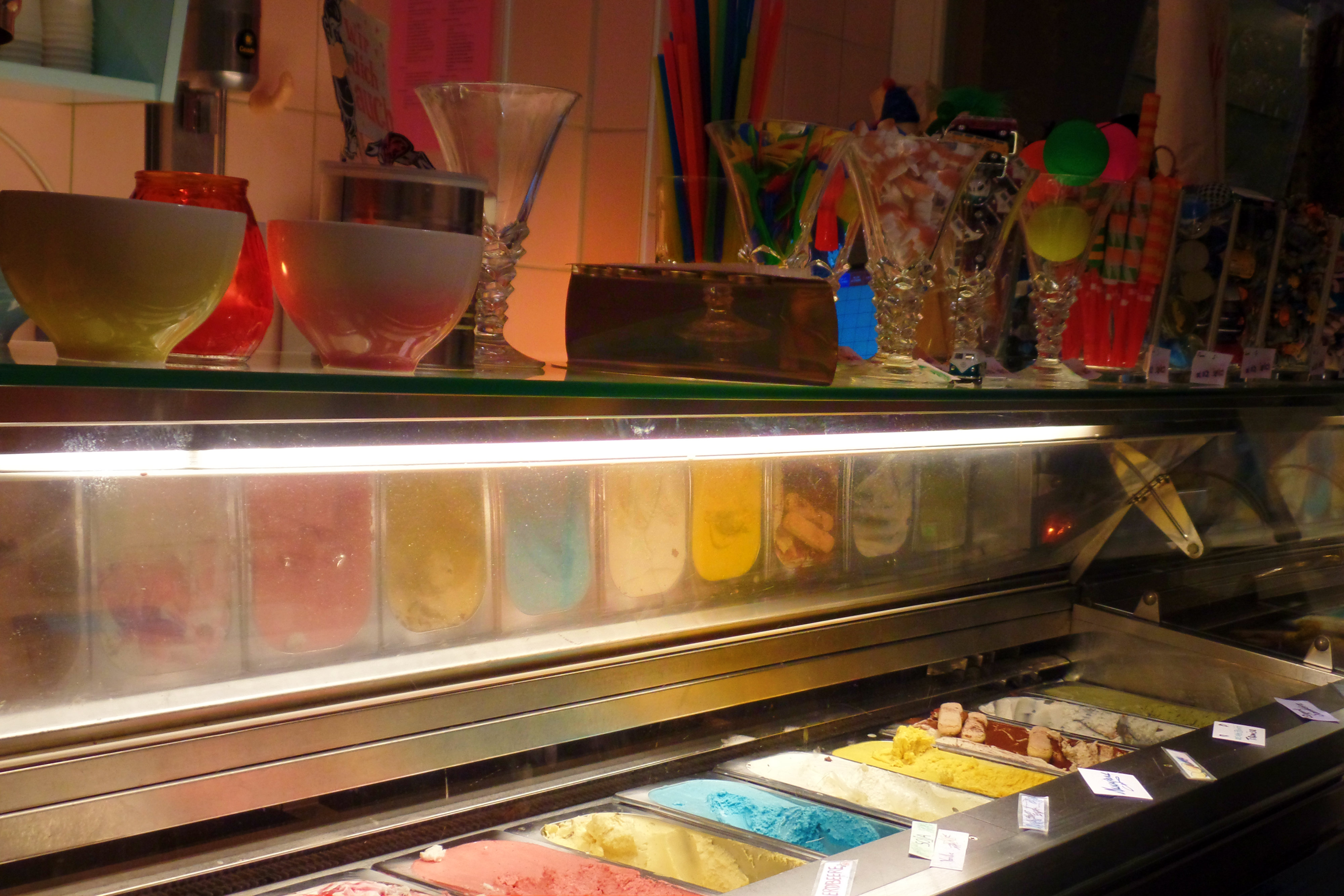 The first thing that happens when you come in is that you are squeezed between a wall and a beautiful rainbow of ice cream flavours, and right next to your face are sundae glasses filled with silly plastic things. After ordering coffee – oh Lord thank you!! – I tore myself away from a 20-cent tentacle finger puppet and we nestled ourselves into some cosy if corny leather chairs. Because it’s normal to be served steaming cups of caffeinated beverages at half eleven at night, right?
